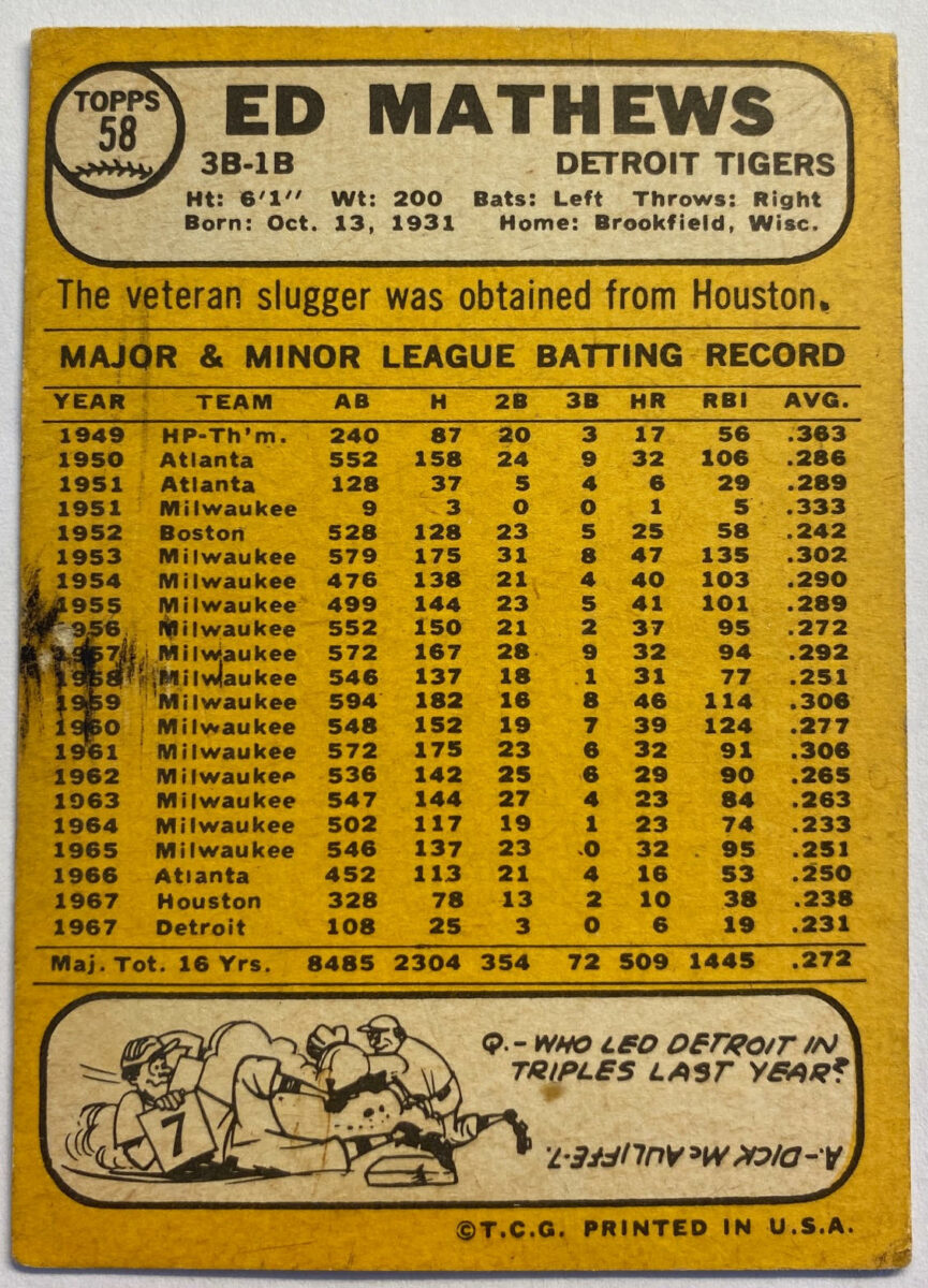 Edwin Lee Mathews was an American Major League Baseball third baseman. He played 17 seasons for the Boston / Milwaukee / Atlanta Braves; Houston Astros and Detroit Tigers