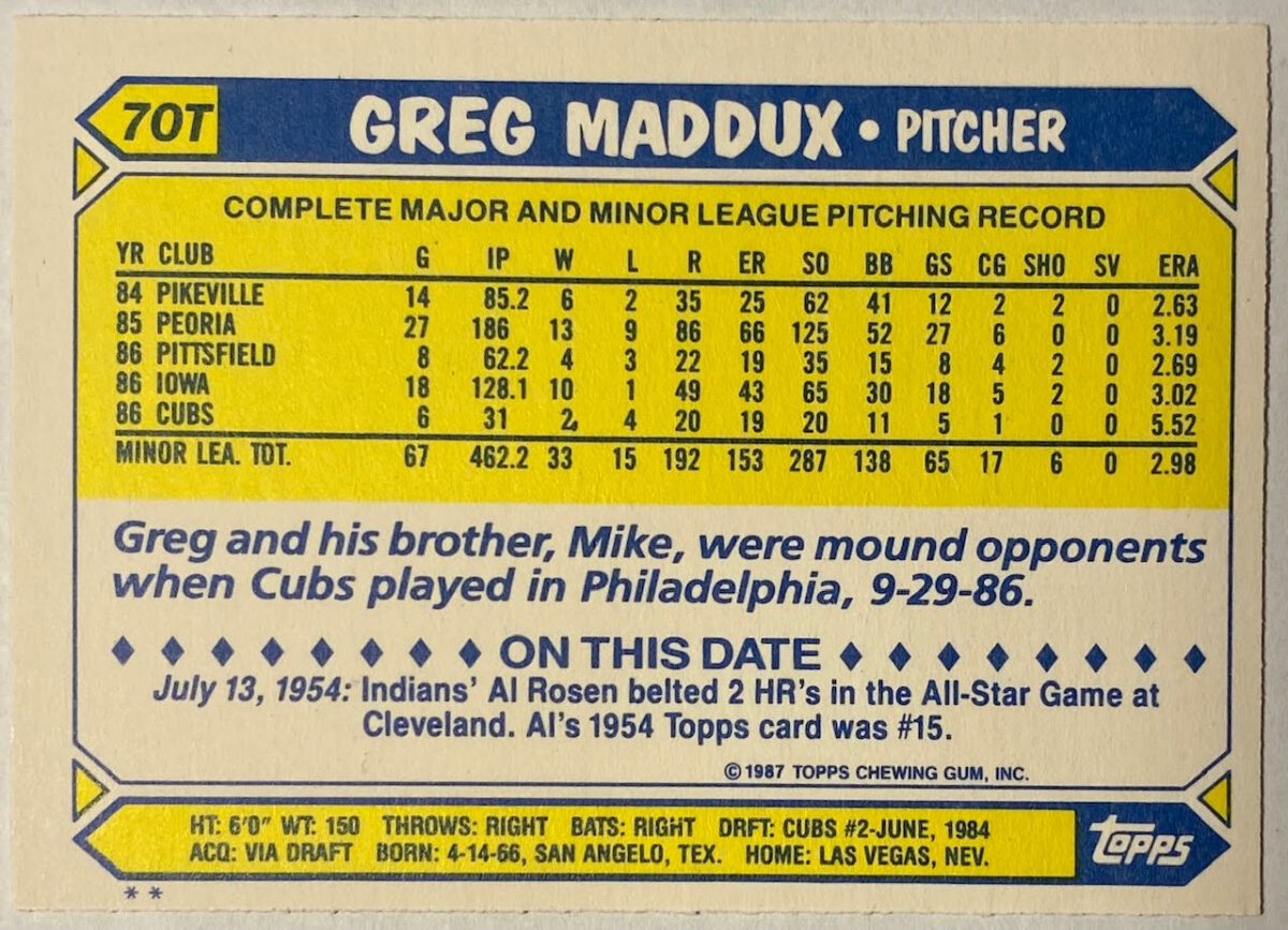 Gregory Alan Maddux is an American college baseball coach and former Major League Baseball pitcher. He is the pitching coach at the University of Nevada, Las Vegas. Maddux is best known for his accomplishments while playing for the Atlanta Braves and the Chicago Cubs.