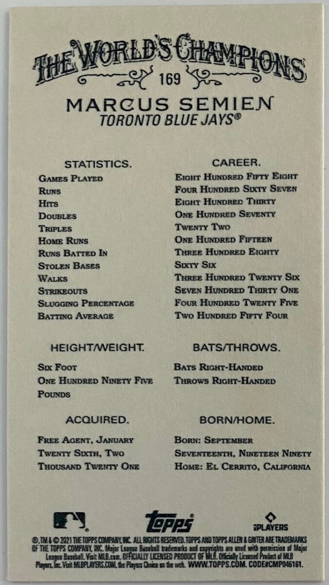Marcus Andrew Semien is an American professional baseball shortstop and second baseman for the Toronto Blue Jays of Major League Baseball. He previously played for the Chicago White Sox and Oakland Athletics.