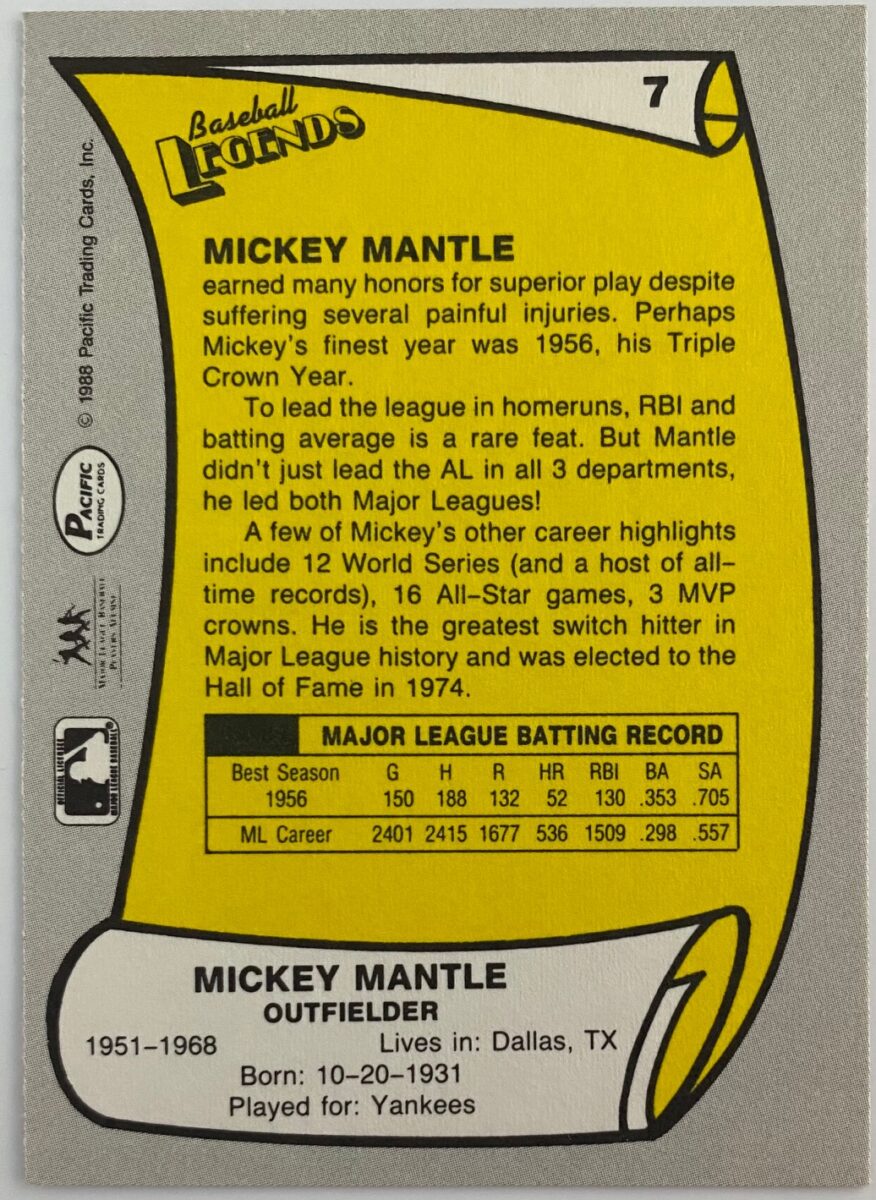 Mickey Charles Mantle (October 20, 1931 – August 13, 1995), nicknamed The Commerce Comet and The Mick, was an American professional baseball player. Mantle played his entire Major League Baseball (MLB) career (1951–1968) with the New York Yankees as a center fielder, right fielder, and first baseman. Mantle was one of the best players and sluggers and is regarded by many as the greatest switch hitter in baseball history. Mantle was inducted into the Baseball Hall of Fame in 1974 and was elected to the Major League Baseball All-Century Team in 1999.
