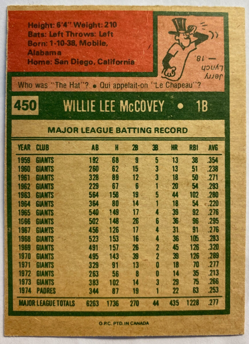 Willie Lee McCovey, nicknamed “Stretch”, “Mac” and “Willie Mac”, was an American professional baseball player. He played in Major League Baseball as a first baseman from 1959 to 1980, most notably as a member of the San Francisco Giants for whom he played for 19 seasons.