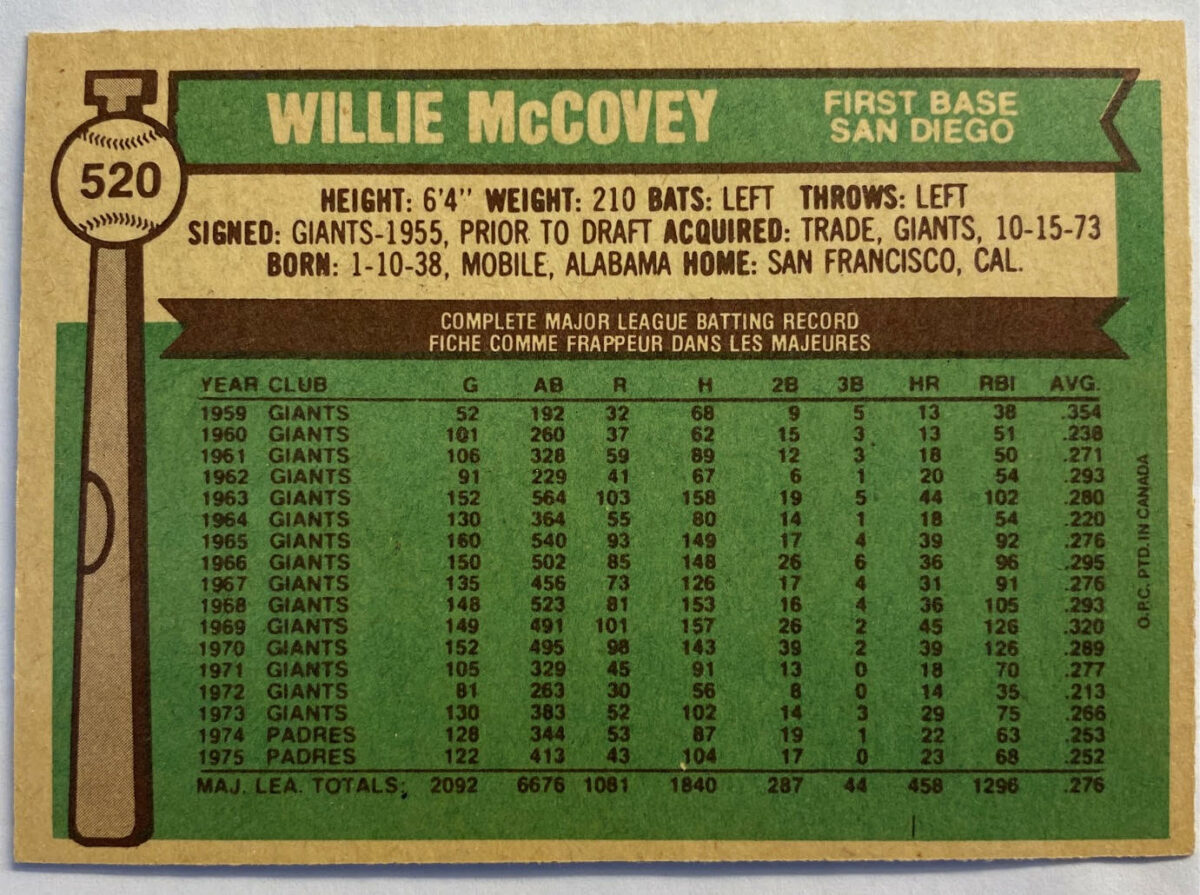 Willie Lee McCovey, nicknamed “Stretch”, “Mac” and “Willie Mac”, was an American professional baseball player. He played in Major League Baseball as a first baseman from 1959 to 1980, most notably as a member of the San Francisco Giants for whom he played for 19 seasons.